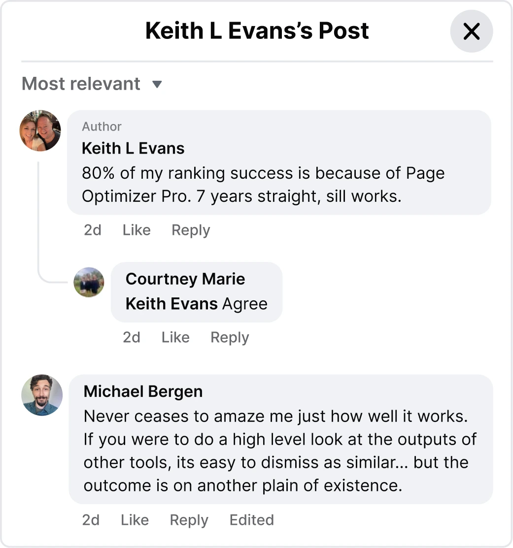 “PageOptimizer Pro is the MOST comprehensive tool when it comes to more "subtle" issues such as correct schema, E-A-T signals and the more common issues such as the presence of specific keywords and ratios.”